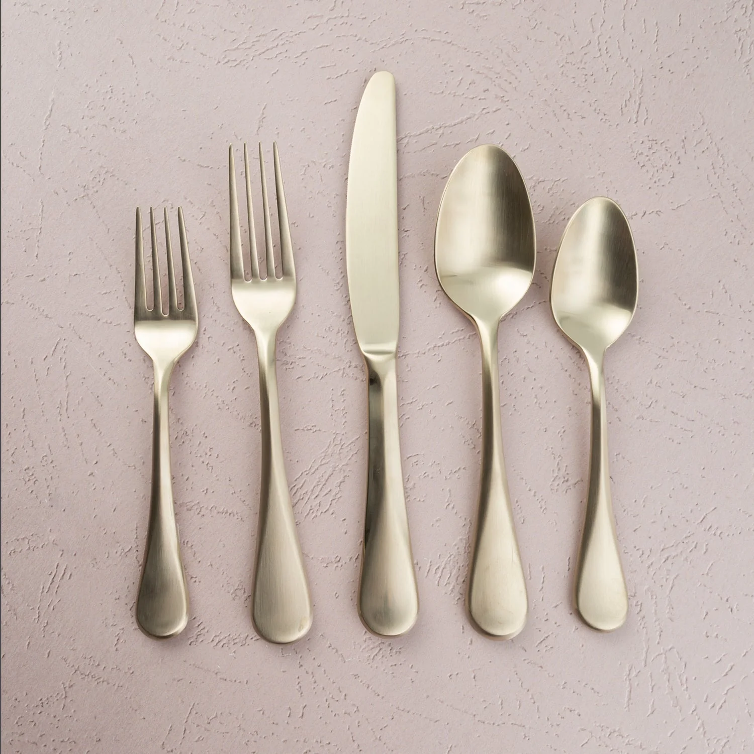 20-piece forged service for 4 made from highest quality 18/10 stainless steel featuring a classic teardrop-shaped handle with an elegant, brushed champagne gold finish.