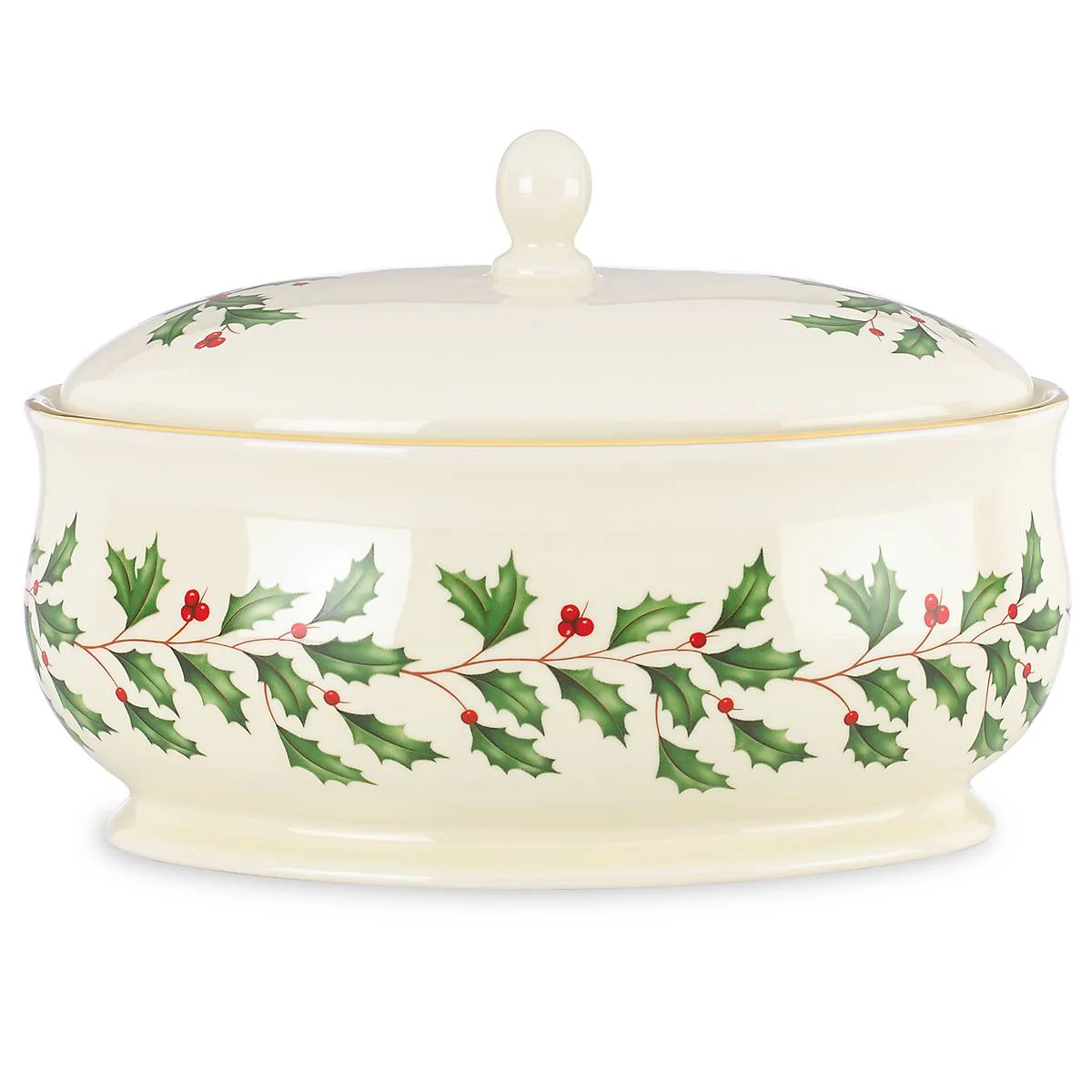 The elegant and spacious Holiday Covered Dish makes hosting holiday meals easier. The ceramic dish features 24-karat gold accents and is decorated with Lenox's iconic holly and berries motif.