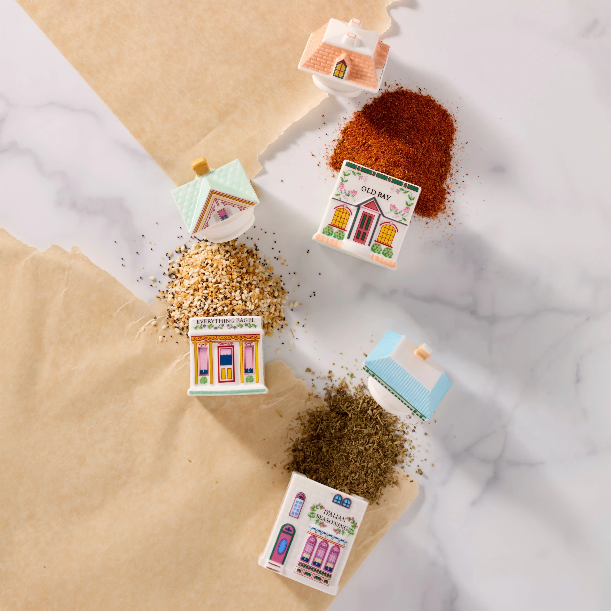 Bring spice and everything nice to your home and kitchen! The Spice Village Italian Market spice jar set gives you the cutest way to store three spices popular in the Philadelphia Italian Market region: OLD BAY® Seasoning, Italian Seasoning, and Everything Bagel. Crafted in Lenox fine ivory porcelain with hand-painted details, it's sure to sprinkle extra joy into your favorite meals.