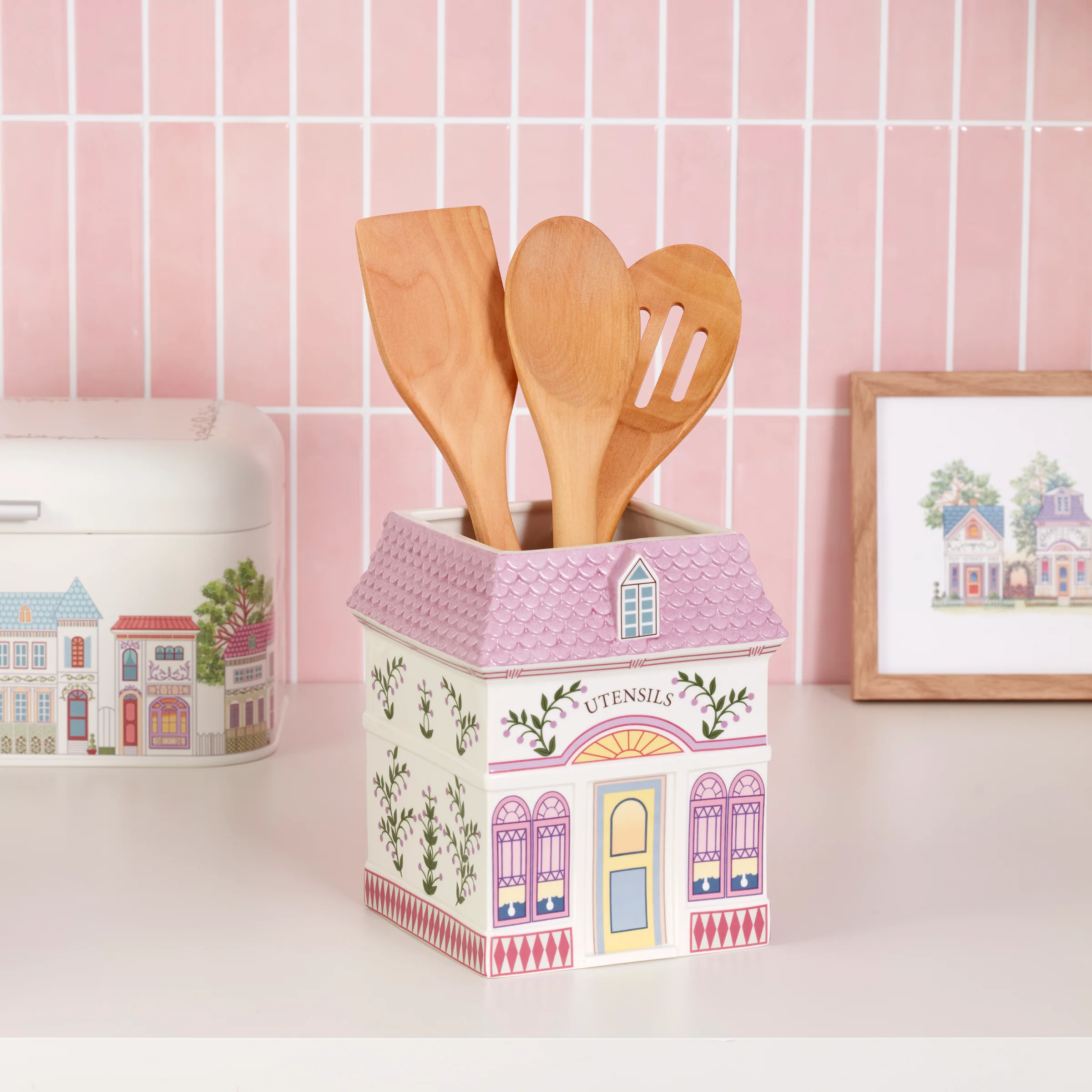 Store and showcase cooking essentials in this Victorian village-inspired utensil crock! As lovely and whimsically nostalgic as the original Lenox Spice Village crock first introduced decades ago, this Second Edition reissue brings storybook charm home with its figural dollhouse-like design featuring artisan-crafted and hand-painted details...each one is unique! Three wooden cooking tools are included...whip up extra sweetness with this pretty piece from Spice Village!